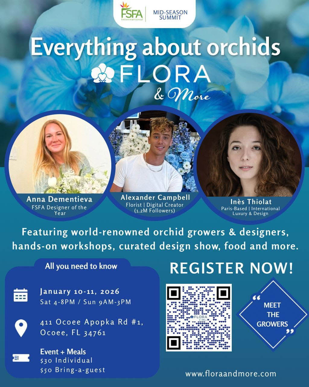 Join us at Flora & More's new location in Ocoee, FL featuring world-renowned orchid growers & designers, hands-on workshops, curated design show, food and more.