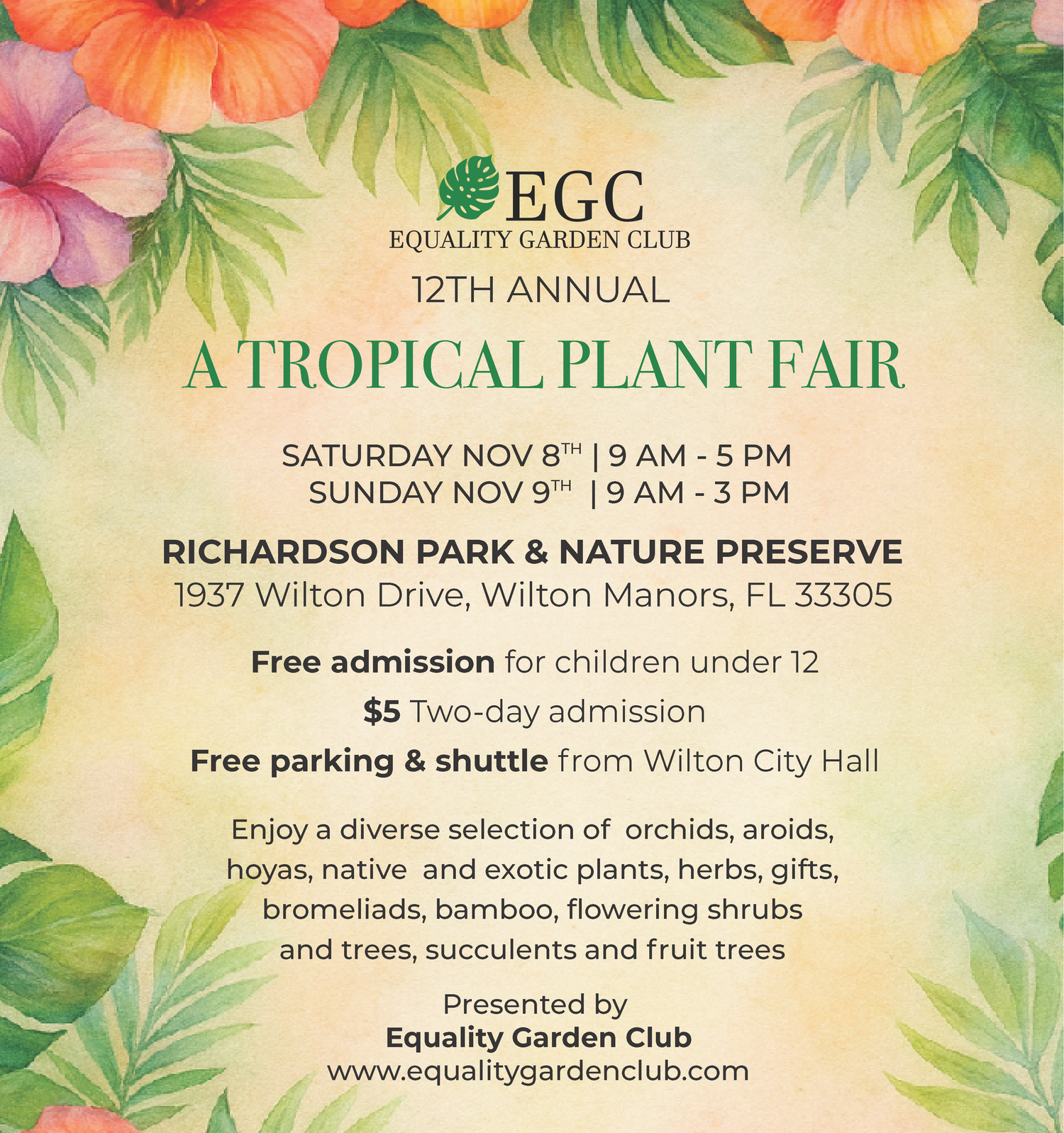 8-9: Presented by Equality Garden Club, A Tropical Plant Fair is Wilton Manors largest plant festival and sale. Enjoy a diverse selection of orchids, aroids, hoyas, native and exotic plants, herbs, gifts, bromeliads, bamboo, flowering shrubs and trees, succulents and fruit trees.
