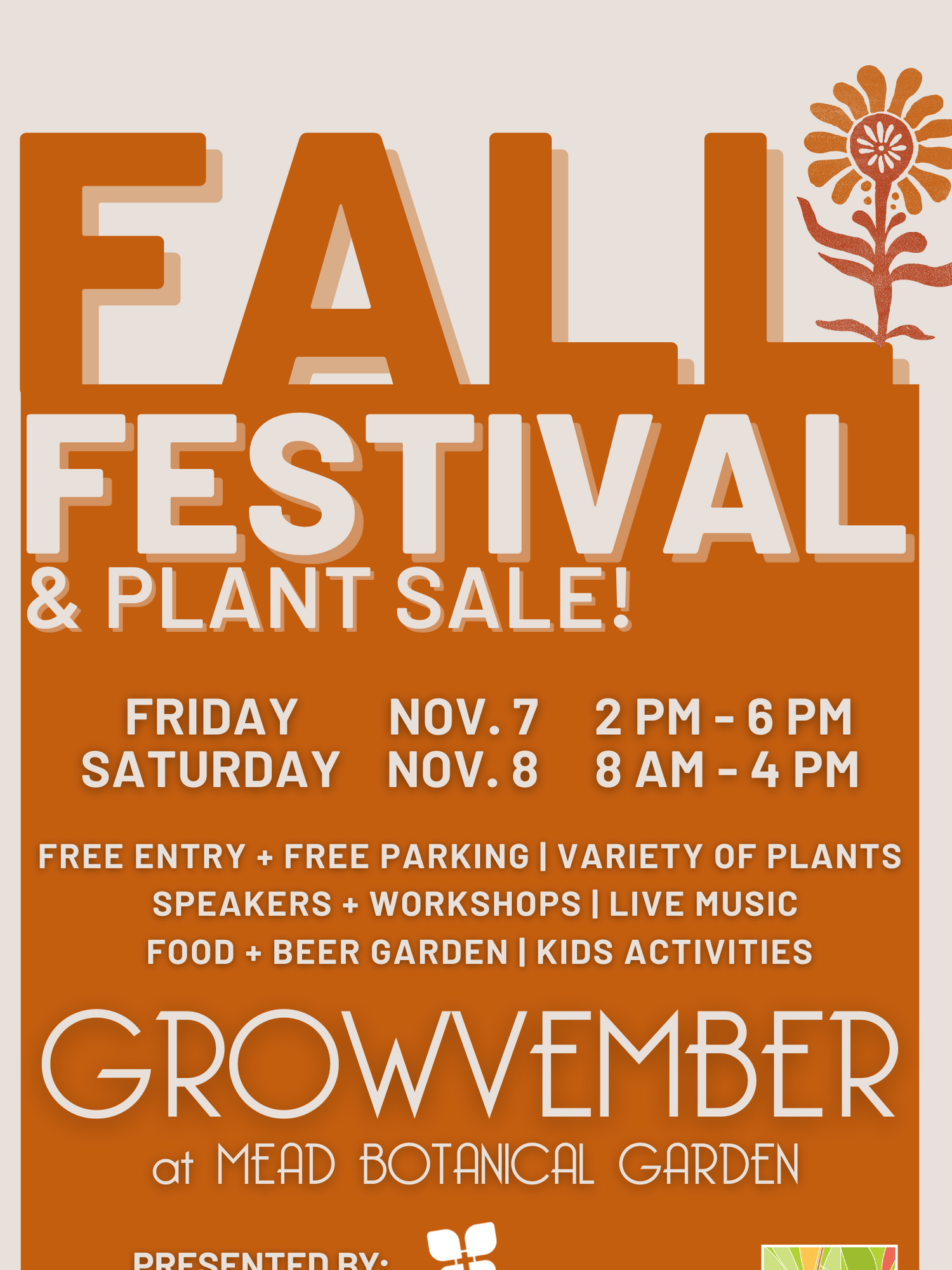 7-8: GROWvember, Mead Botanical Garden’s annual plant sale, features a fabulous array of high quality plant vendors and exhibitors, kid’s activities, live music, food trucks, beer garden and more!
