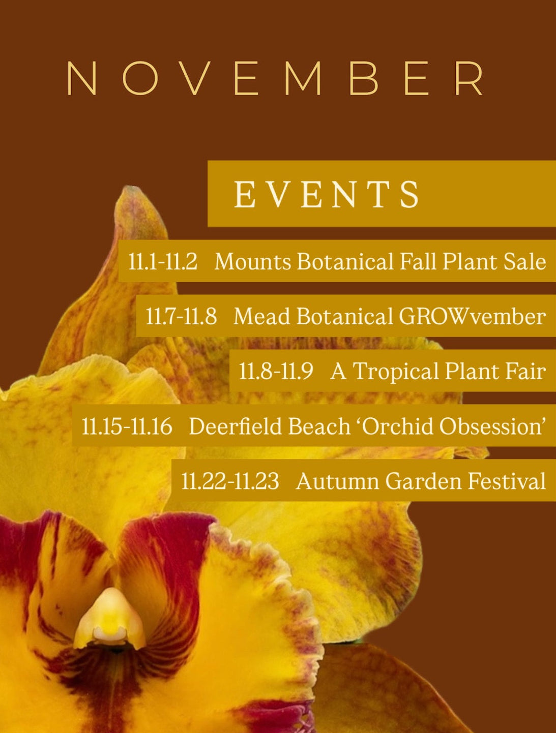 Starting back in our hometown with Mounts Botanical Garden Fall Plant Sale, then a double-header with Mead Botanical Garden's GROWvember and A Tropical Plant Fair in Wilton Manors. Next up is Deerfield Beach Orchid Society's 'Orchid Obsession', followed by the Autumn Garden Festival at Edison and Ford Estates.