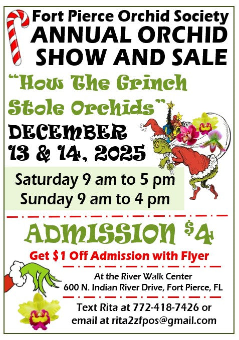 12/13-12/14: Join us for Fort Pierce Orchid Society's Annual Orchid Show and Sale "How The Grinch Stole Orchids" Saturday 12/13 and Sunday 12/14 at the River Walk Center in Fort Pierce. The gift basket raffle is unlike any other! You won't want to miss this event.