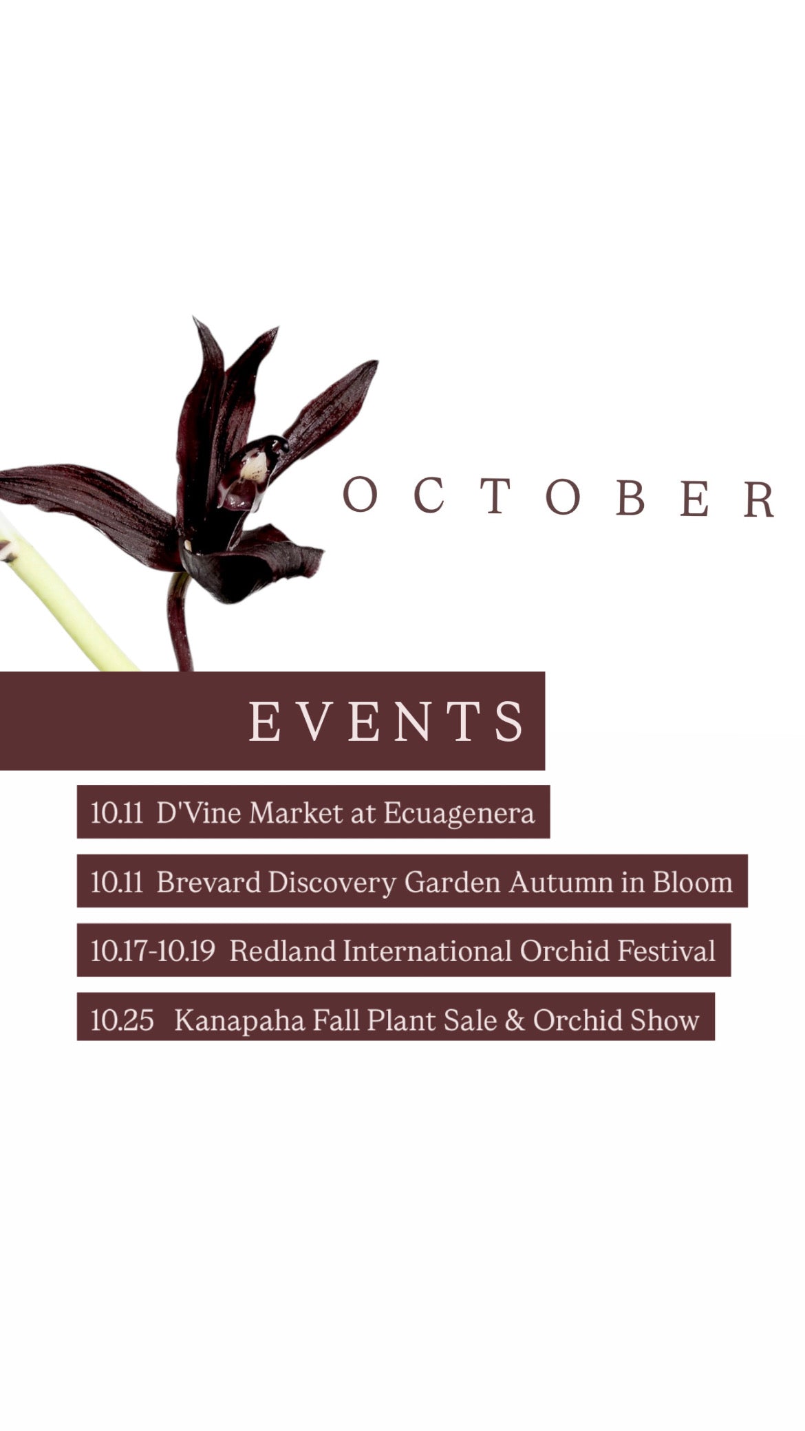 Starting with a double header on 10/11 with the D'Vine Tropical Plant Festival at Ecuagenera and Autumn in Bloom at the Brevard Discovery Garden, followed by the one and only Redland International Orchid Festival 10/17-10/19, and finishing it off strong with the Kanapaha Fall Plant Sale & Orchid Show on 10/25.
