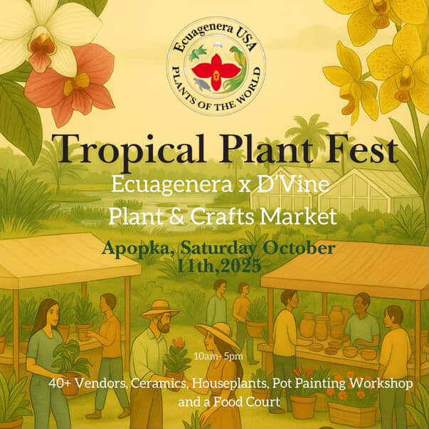 11: Join us for a plant filled market day at Ecuagenera’s Apopka (Florida) nursery, hosted in collaboration with D’Vine Market. Only 25 minute drive from downtown Orlando. Explore rare orchids, aroids, and tropical plants, shop handmade crafts, and connect with local vendors for a full day of plants, community, and fun.